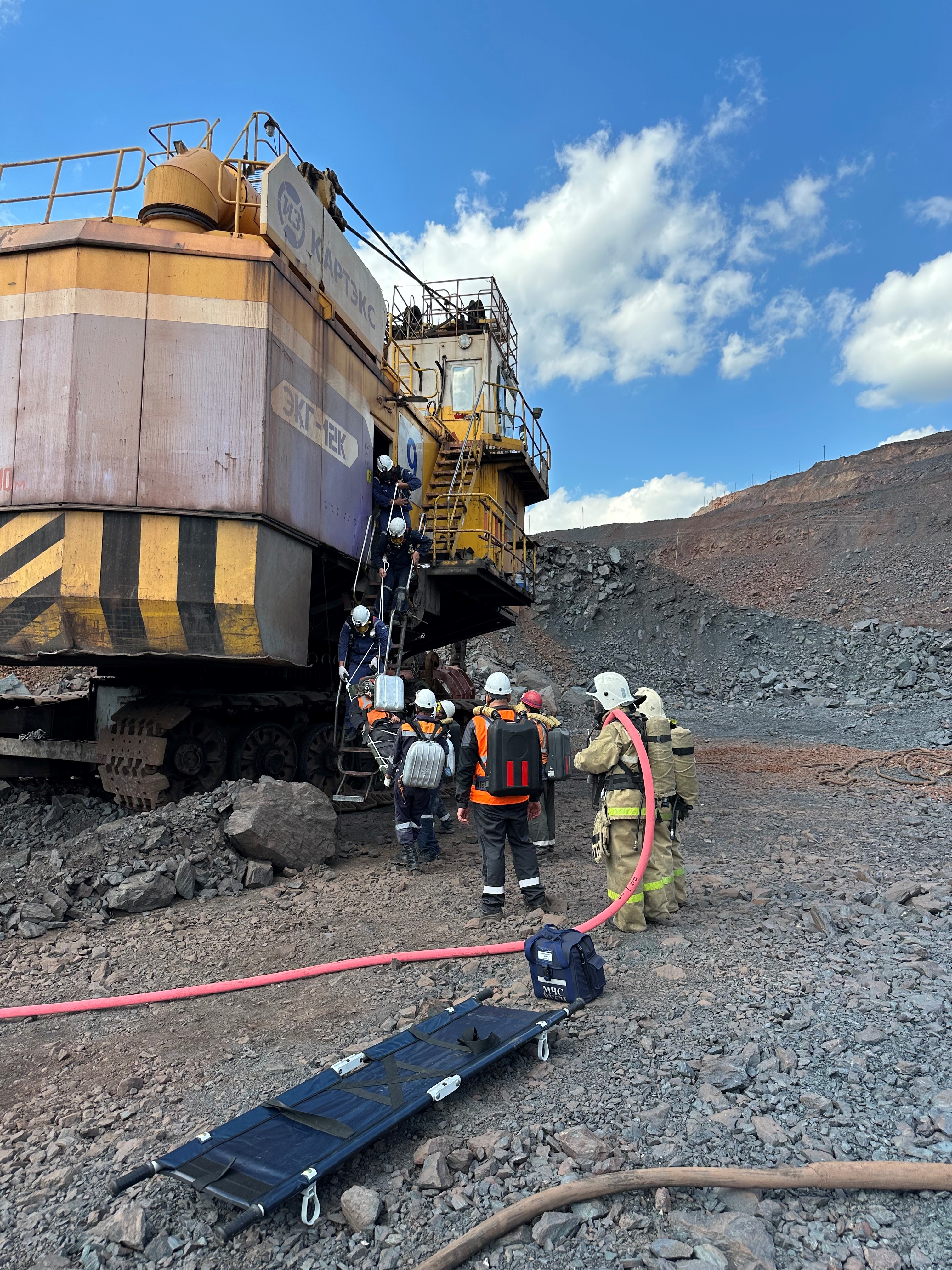 Цель учений - отработка практического взаимодействия работников предприятия со службами быстро реагирования при чрезвычайной ситуации - возгорание технического устройства - экскаватора ЭКГ-12К, хоз. № 9 с последующим отравлением работников газом.