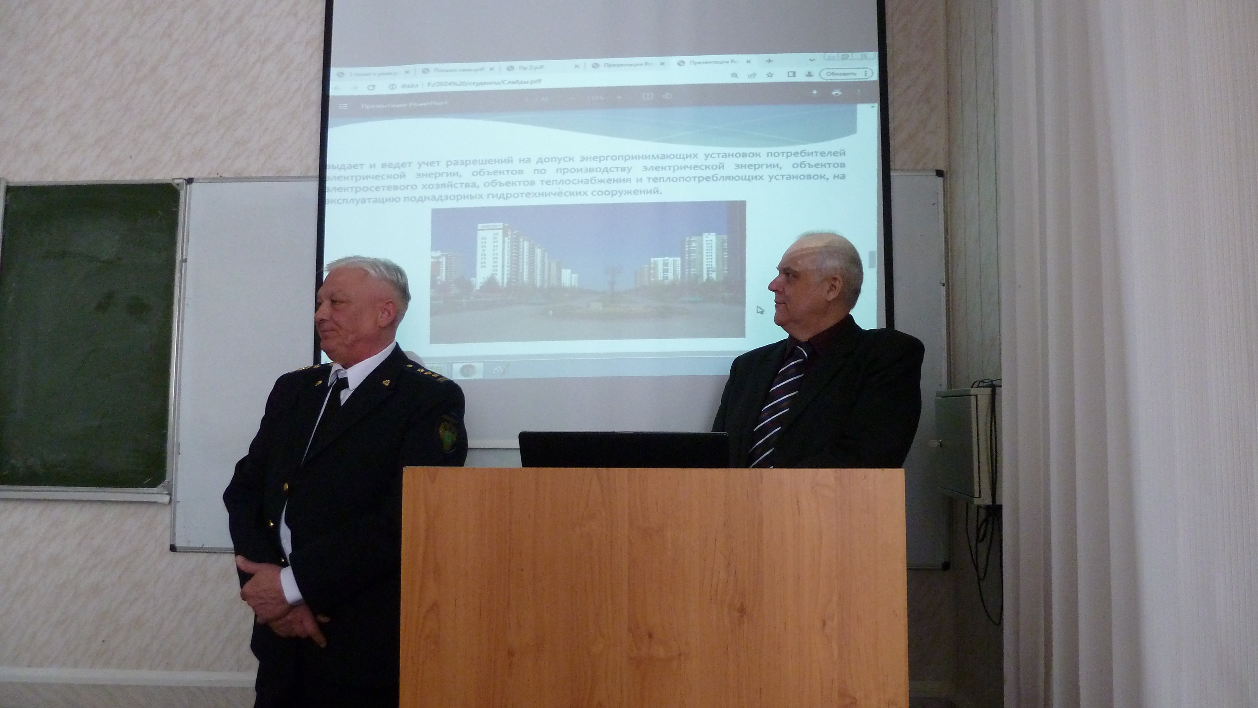 Главный государственный инспектор отдела государственного энергетического надзора и надзора за гидротехническими сооружениями Юрий Мандрыкин и государственный инспектор отдела государственного энергетического надзора и надзора за гидротехническими сооружениями Геннадий Чурсин провели встречу со студентами Воронежского государственного технического университета.